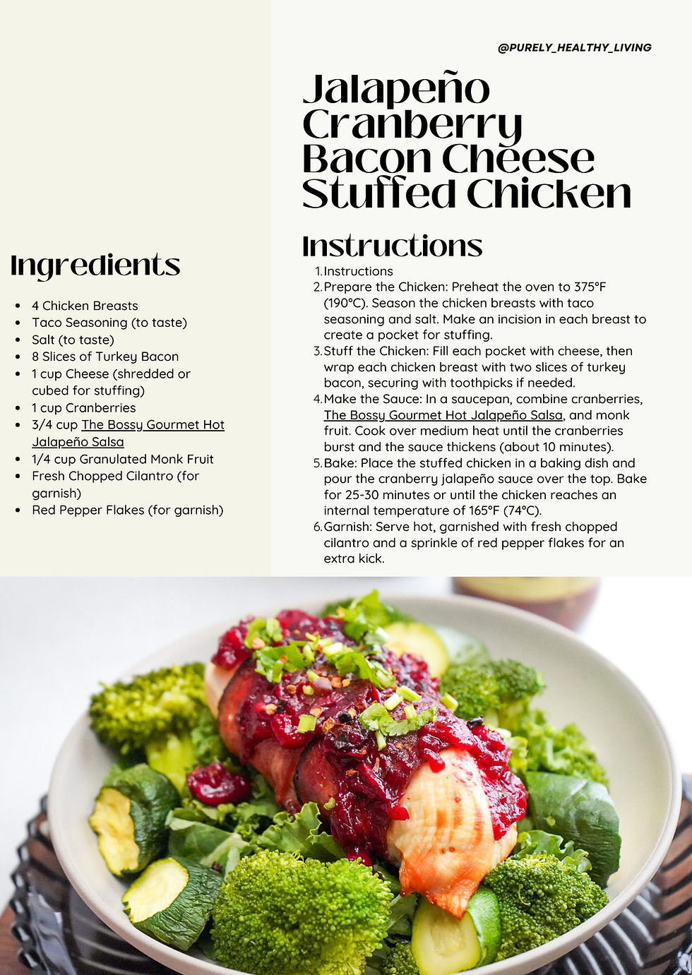 What sets this recipe apart is the harmonious fusion of tangy cranberries and spicy jalapeños, enhanced by the smoky flavor of turkey bacon wrapping around juicy chicken breasts. Each bite delivers a burst of flavor, making this dish a standout choice for gatherings or a cozy weeknight dinner. Experience the quality of The Bossy Gourmet as you delight in this extraordinary culinary creation.